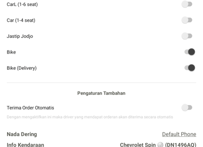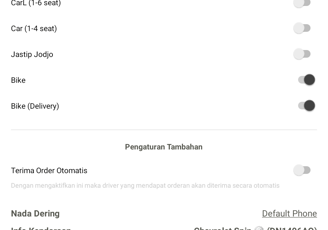 Silakan klik tombol "Layanan aktif saat ini". Aktifkan tipe layanan yang akan dijalankan dan atur mode terima otomatis (TOO). Jika TOO tidak aktif, notif akan tampil di layar selama 10 detik, jika TOO diaktifkan, orderan akan masuk otomatis "Status Diterima". Pemberitahuan orderan akan diterima hingga jarak 1 km dari titik jemput.